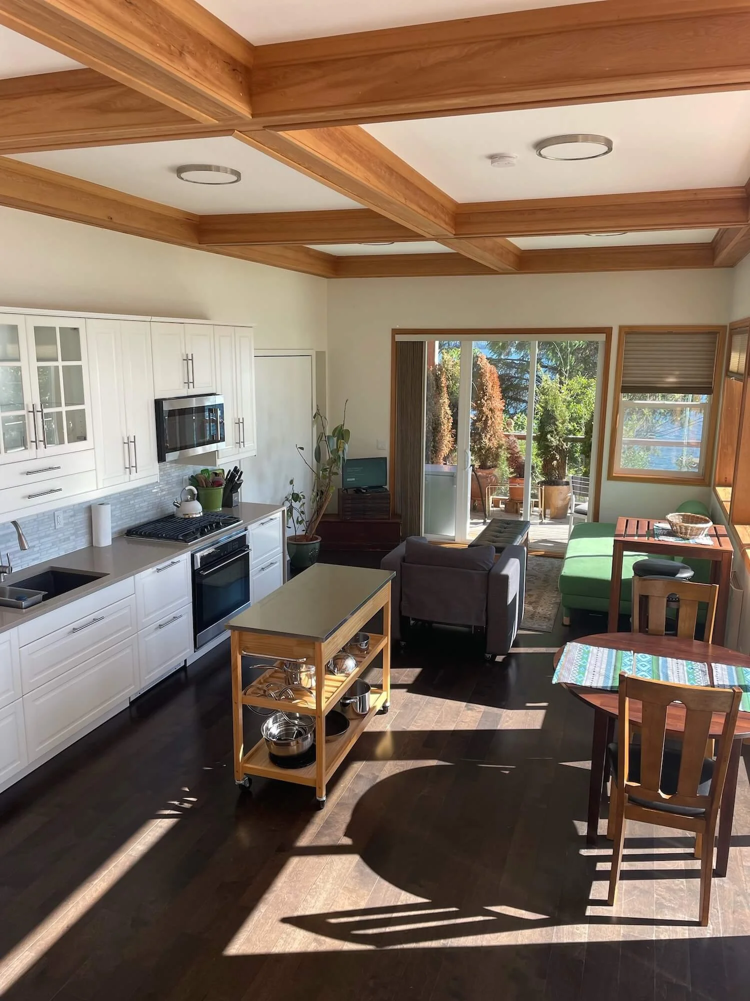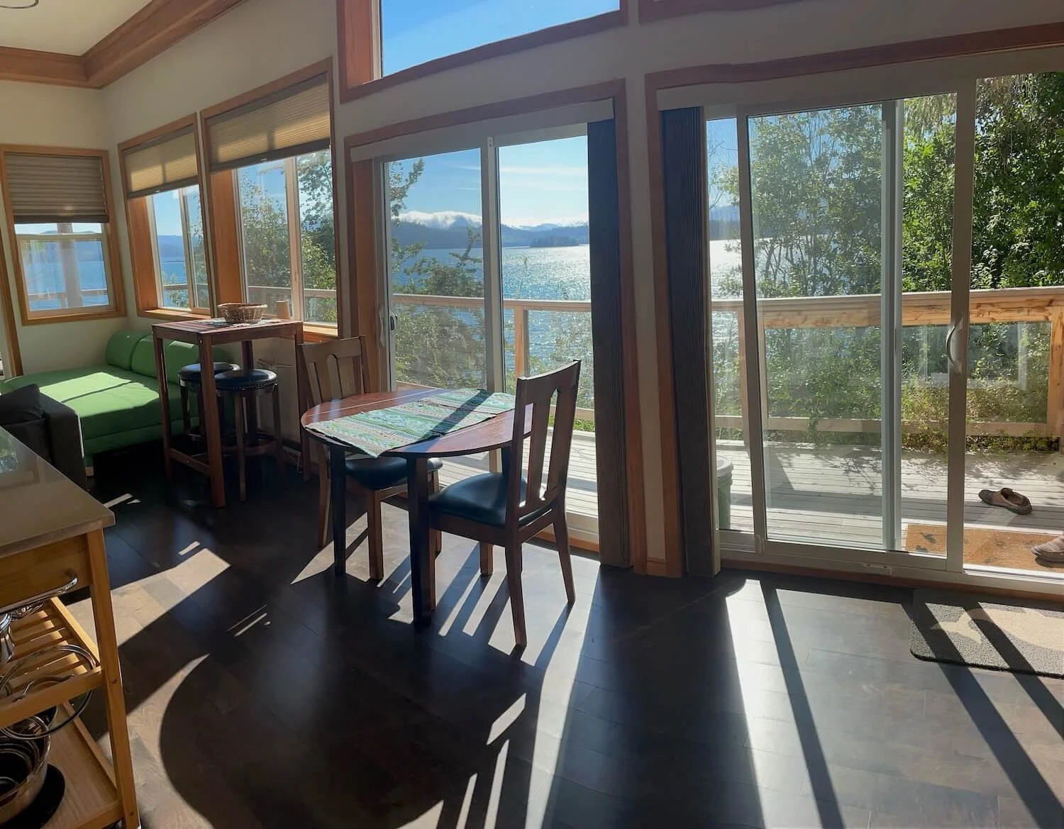 A brand new beautiful, waterfront, versatile studio unit overlooking the Skidegate inlet, Daajing Giids Queen Charlotte City. This modern home has a fully equipped kitchen, including a dishwasher, and the unit comes with a washer and dryer and a strong wifi connection. The space is compact but highly functional, with two queen Murphy beds and a wrap-around deck on the ocean's edge is equipped with a bbq and is the perfect Haida Gwaii getaway for singles, couples or families.